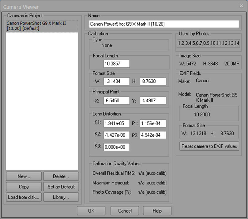 The Camera Viewer Dialog is used to view and manipulate the cameras used by the current project, and also provides access to the Camera Library. You can create new approximate cameras, delete a camera, copy a camera, modify camera parameters, load cameras from disk, and access the camera library from this dialog. This dialog is accessed through the "Cameras..." tool on the ribbon toolbar’s Review Tab item, and Photo Properties from the "Open Camera Viewer…" hyperlink.