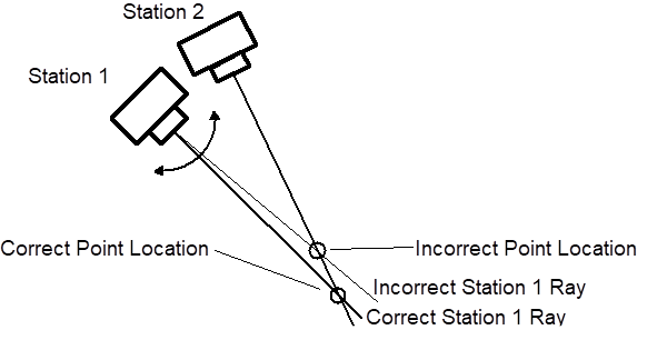 The process of measurement is never perfect. Measurement is instead the process of reducing and minimizing errors to maximize accuracy. If PhotoModeler has incorrect camera positions or orientations, it will generate an incorrect position for the 3D point. The figure below shows such a case. It depicts two cameras in which the orientation of Station 1 has been calculated incorrectly by a few degrees. PhotoModeler then incorrectly calculates the position of the 3D point because of the shifted light ray.