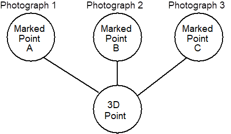 This document refers to Marked Points, 3D Points and Points. A Marked Point is on a photograph, a 3D Point in on an object or in a 3D scene and a Point refers to some location in space and is usually synonymous with 3D Point. Marked Points are associated with 3D Points on a many-to-one basis. As Marked Points are referenced together they become to share the same 3D Point. The figure below illustrates this conceptual relationship: