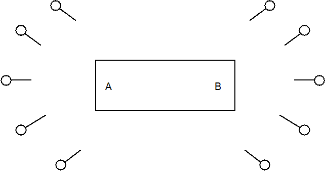The two ends of the building at A and B might be accurately measured but might not sit correctly relative to each other because only a few points are shared between the cameras at the A end and the cameras at the B end. If the points shared between the two ends appear on only two photographs, the A and B ends might still not sit correctly relative to each other. In this case, more Camera Stations need to be added along the edge of the building to better tie the two ends together.