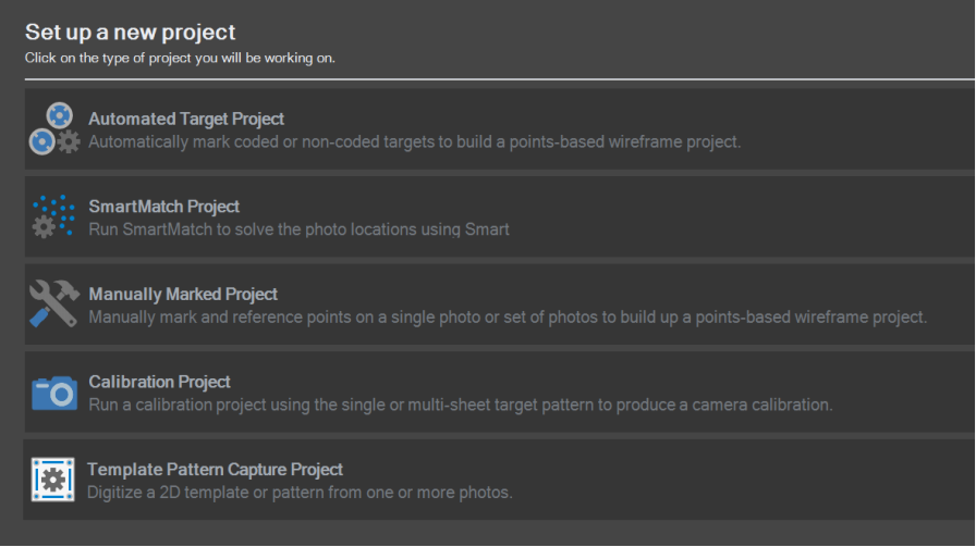 PhotoModeler Standard New Project Types