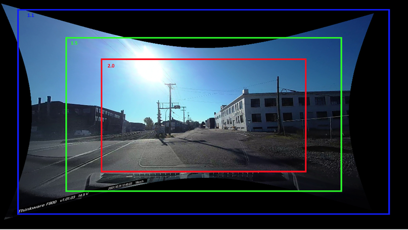 The third control sets the zoom factor. The ‘Output zoom factor’ controls how the image pixels will cover the output image. For the default value of 1.0, the output is sized so that all original source image pixels remain in the output image. This means that some part of the resampled input will touch at least one edge of the output image. Note it may not touch all edges, depending on the principle point and the decentering distortion of the original camera. Cameras with high distortion can have big black border areas and not as much useful image data.