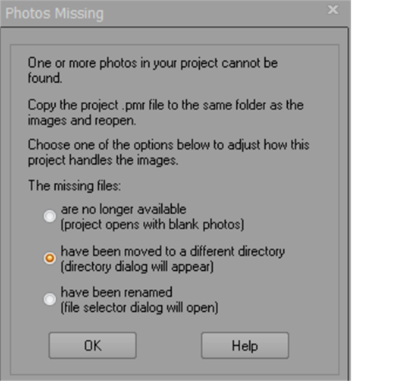 Whenever you open a project, PhotoModeler checks to see if all the photo image files are still at the locations defined by the absolute paths (e.g. d:\Projects\Car 1\img1.tif). If it cannot find one or more images the dialog above appears.
