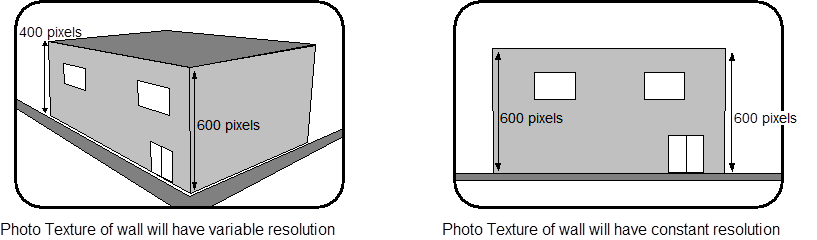 The following building model example illustrates this point. The photograph on the left has large perspective distortion on the walls and the roof whereas the photograph on the right has little distortion on the front wall. Both photographs could be used for texture extraction but the results using the photograph on the left would not be as good due to variable photographic resolution.
