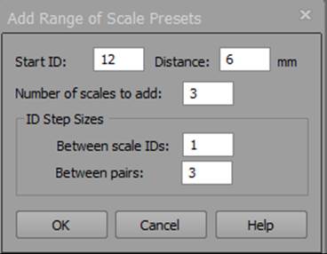 The Add Range of Scale Presets dialog is used to create multiple scales between pairs of Coded Targets with sets of incrementing ID numbers.