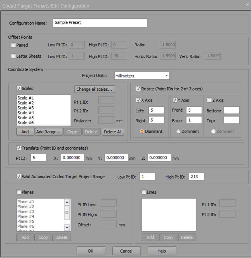 This dialog is used to edit a configuration of coded target presets. These settings are applied to coded target points in an existing project with appropriate coded target points marked, or a new Automated Target Project where the coded targets have been laid out.