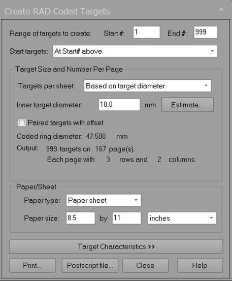 The Create Coded Targets dialog is used to output coded targets (print or generate a Postscript file to be used in the printing or manufacture of the targets).