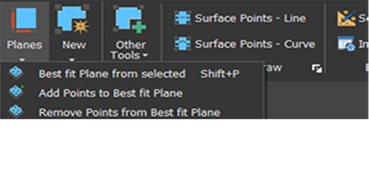 You can also use the “Best fit Plane from selected” to fit a plane through the currently selected items, such as points (regular or point cloud points), lines or mesh contours. Select the objects and then click “Best fit Plane from selected objects” tool. When using point cloud points, first use Cloud/Mesh Edit mode (use Shift key to combine multiple selections) or Cloud/Mesh Edit Region to select a subset of points in the point cloud – then use the Best Fit plane tool to create the plane.