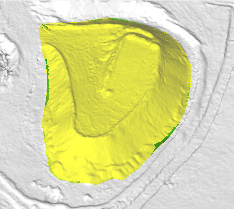 • Along with the extracted triangles, a volume plane base is computed and displayed. How the base is calculated can be controlled by the Volume Properties. The volume surface is shown in yellow and the base in a transparent green.