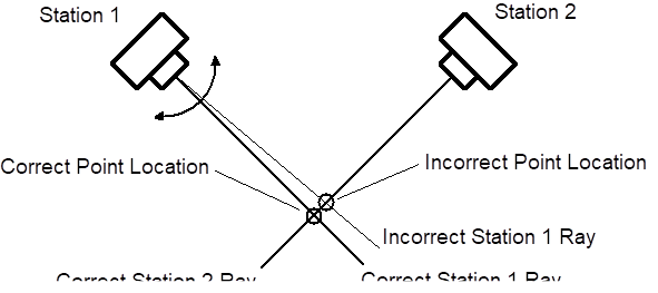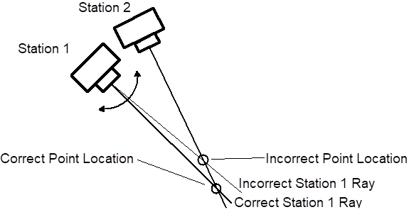 The process of measurement is never perfect. Measurement is instead the process of reducing and minimizing errors to maximize accuracy. If PhotoModeler has incorrect camera positions or orientations, it will generate an incorrect position for the 3D point. The figure below shows such a case. It depicts two cameras in which the orientation of Station 1 has been calculated incorrectly by a few degrees. PhotoModeler then incorrectly calculates the position of the 3D point because of the shifted light ray.