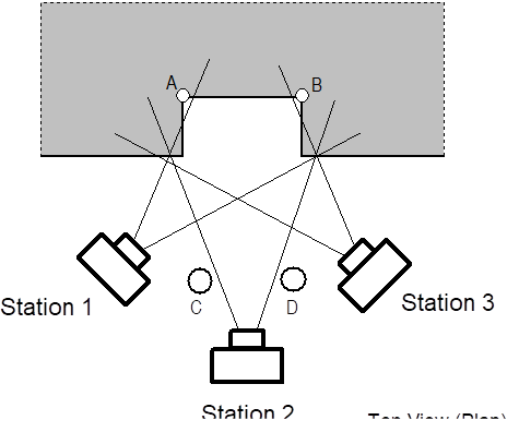 The figure below shows an interesting case of trying to get each point imaged on three photographs. In this example we are measuring a hole, a dent in some object or an inset doorway/alcove in a building. When the hole has straight edges, it is difficult to get points A and B imaged on three photographs if only three stations are used. To get around this problem we would take two more photographs at positions C and D. Some of the outside points would be imaged on five photographs and points A and B would be imaged on three photographs.