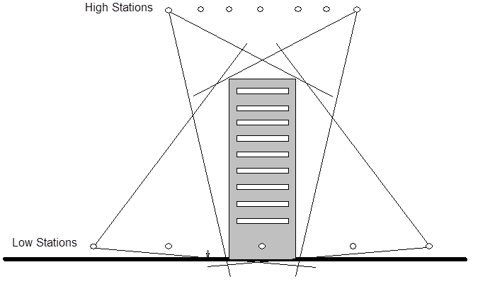 The figure below is a somewhat extreme example of this. In this figure a tall building is being measured. All the photographs could be taken from the ground, but the points along the roof line would be very far away from the ground level photographs, and hence would be harder to mark (because they would be smaller in the photographs than points along the ground). This would make the roof top points less accurate than the ground level points. The ideal solution would be to take some photographs from above the building. This could be done if there were adjacent buildings that were taller, or if an airplane or helicopter was used. In this case the Camera Stations above the building, and at ground level on one side of the building, are close to being 90 apart.