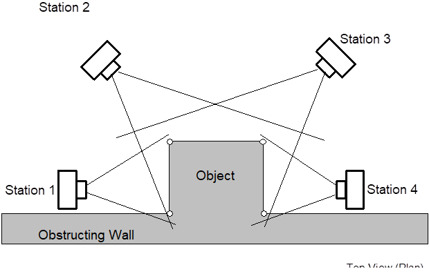The figure below shows a case in which two photographs have no overlap because of an obstruction. A box shaped object is being measured, but on one side of it there is a wall stopping the photographer from capturing the fourth side. For this reason, the photographs at Station 1 and 4 do not overlap. In other words, they share no common points on the object. This measurement can be done, but some of the points marked will appear on two photographs only. These points near the wall will probably have lower accuracy than the rest of the measurement because of a lack of redundancy and poor strength in the geometry of the network of points and cameras.