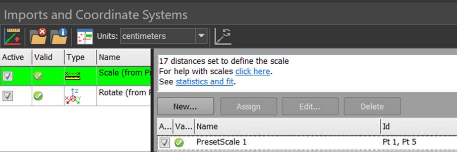 The Imports and Coordinate Systems Pane is used to add information such as distances, x,y,z measurements, coordinate frames, meshes, and 3d models from an outside source to the PhotoModeler project. The external measurements can be manually added or imported from a file (.txt, .dxf, .obj). The external geometry can be used as scales, translations, rotations, point coordinates (for coordinate transform and control), geographic point definitions, pinned and static model imports, and check distances or check points.