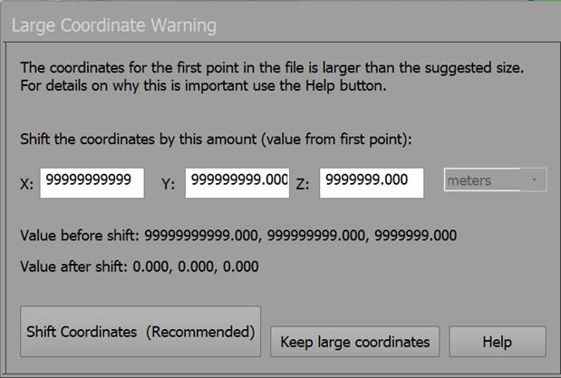 When importing a coordinate file there can be issues if the coordinates in the file have large numeric values. This can happen with some geographic based values. Due to the way coordinates are stored in PhotoModeler, very large values may have insufficient precision. This can lead to several issues with 3D displays. PhotoModeler detects if an import file has coordinates that are too large and brings up this dialog.