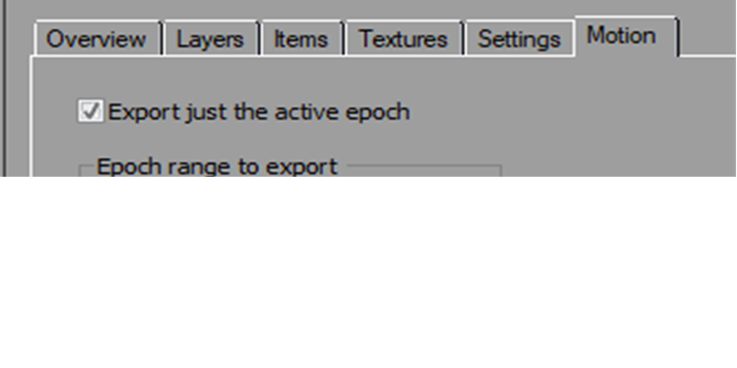 If the export project is a motion project type (see Time-based Measurement / Motion Projects), the Motion tab is available to set whether just the active or a range of epochs epoch should be exported: