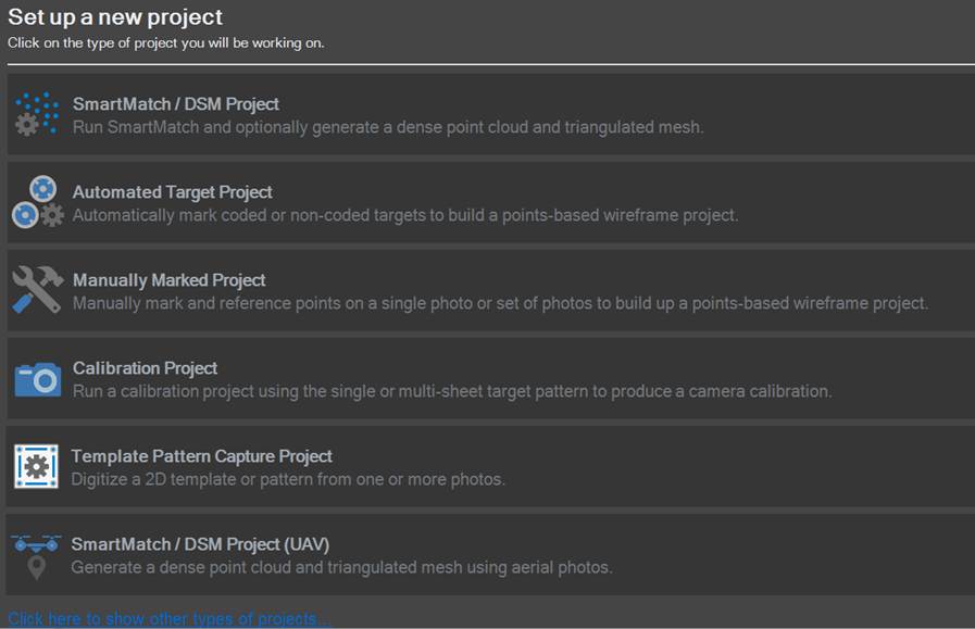 Note that DSM projects are only available in PhotoModeler Premium. The “Click here to show other types of projects…” in Premium link reveals buttons to initiate the less often used Motion project.