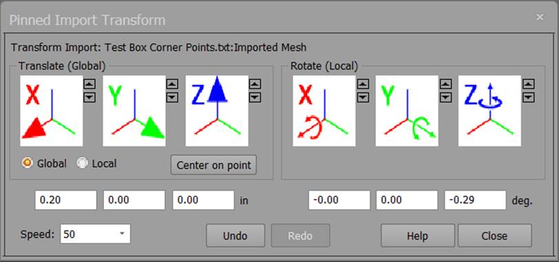 o The ‘Center on point’ button that will translate the import to be centered on a selected 3D point (one-time action)