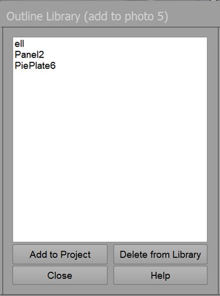When pressed the Outline Library dialog opens and lists all the Library items that have been saved. If you select an item you can delete it, or add it to the current project.