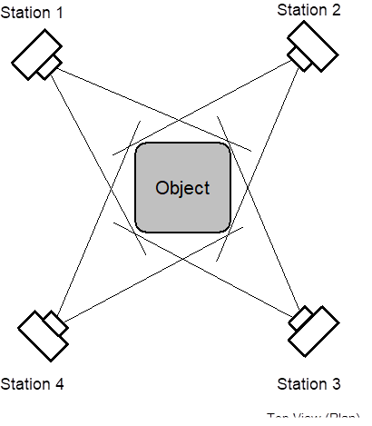 If you are measuring a box shaped object and you are using four photographs, take the photographs off the four corners of the object. All the photographs can be taken at the same level but one or two sides of the box will not be photographed. Often missing a side is not important. The figure below shows the top or plan view of such a camera layout: