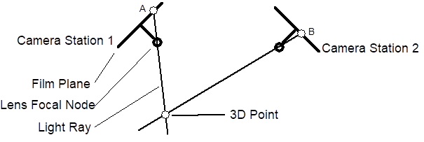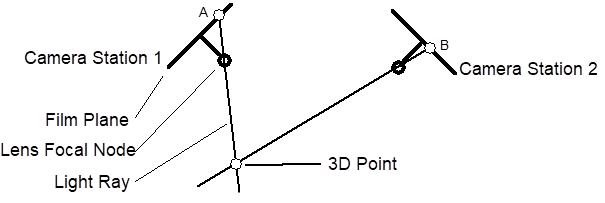 PhotoModeler generates the 3D positions of points by projecting straight lines from the camera position, through the point on the film or CCD and out into space. When two such rays are used, the intersection of the rays gives the point position. The following figure depicts this method: