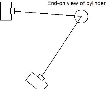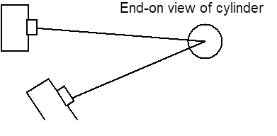 The following diagram shows the end-on view of a cylinder and the two camera positions for two photos being use to reference it. This example would give a good cylinder result.