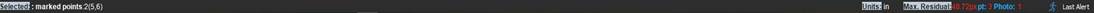When more than one item is selected the status bar simply shows the count of each item type, along with the id of each item. For example this status bar shows that 2 marked points (id 5 and 6) are selected, that the maximum residual is 48.72 for point 3 on photo 1, and that automatic processing is on (running vs stationary processing man icon):