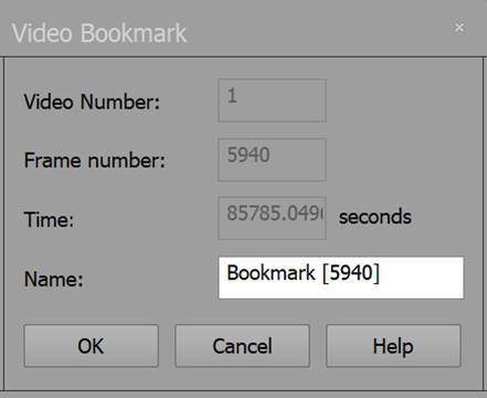 The Video Bookmark Edit dialog is used to change the name of the video bookmark (and the time for an Image Sequence). It is opened from the Video Bookmarks Pane.