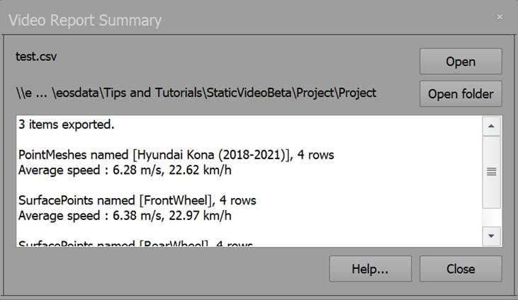 This dialog shows a summary of the objects that were modeled at the bookmarks and their average computed speeds. You can press the Open button to open the program associated with CSV files (often a spreadsheet program) with the file loaded, or you can press Open folder to see the exported csv file there.